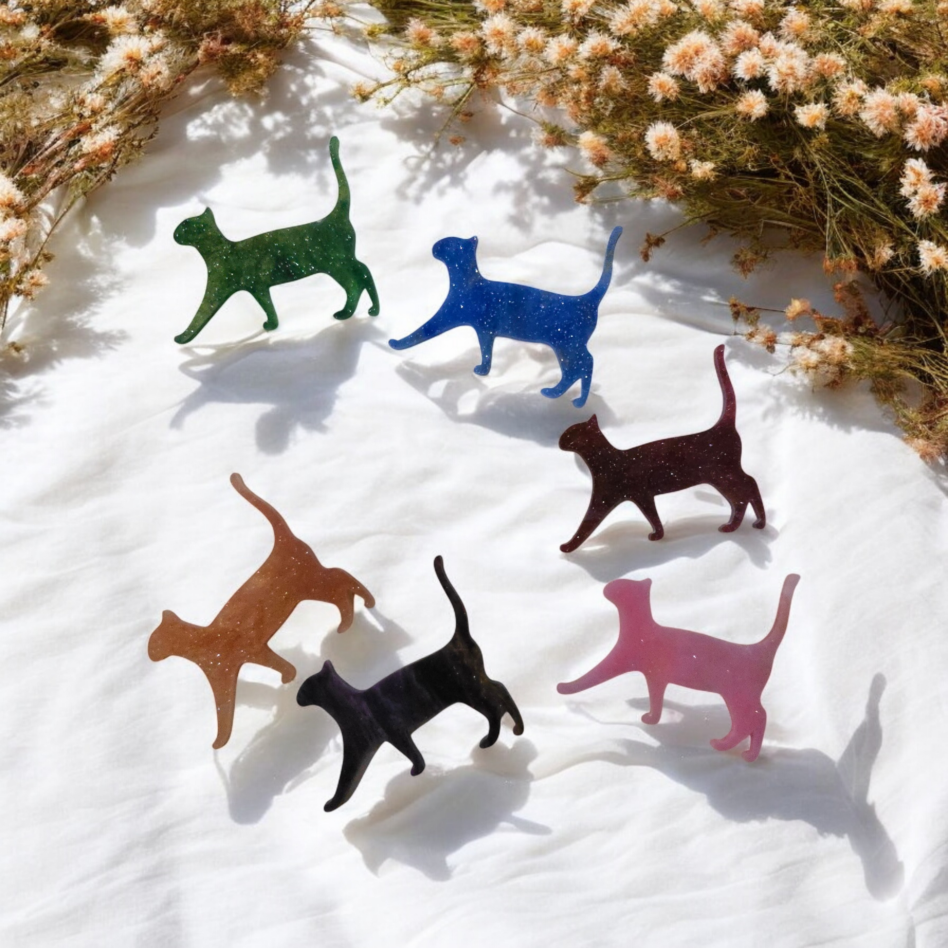 Each pin features a playful cat silhouette, crafted to add a touch of whimsy to any outfit. Available in seven delightful colors: